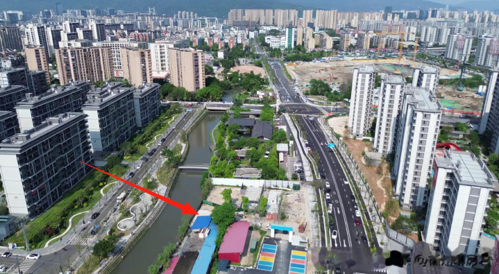 从航拍的画面可以看到,13号南面是跃进河,跃进河的南面是当时几个村庄拆迁时安置过来的庙宇,置业顾问很早就说会搬离,但现在还未改变。